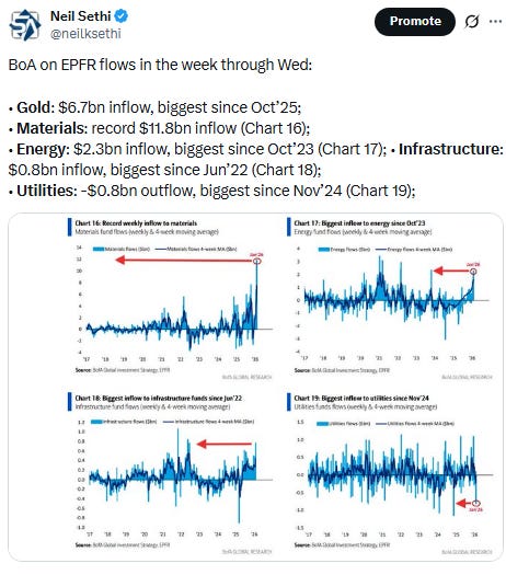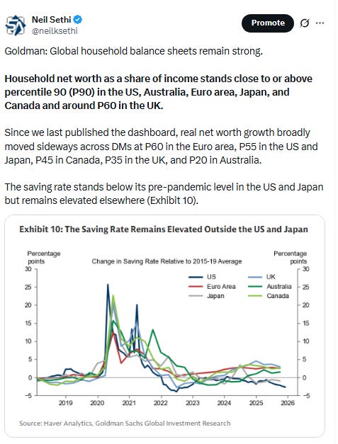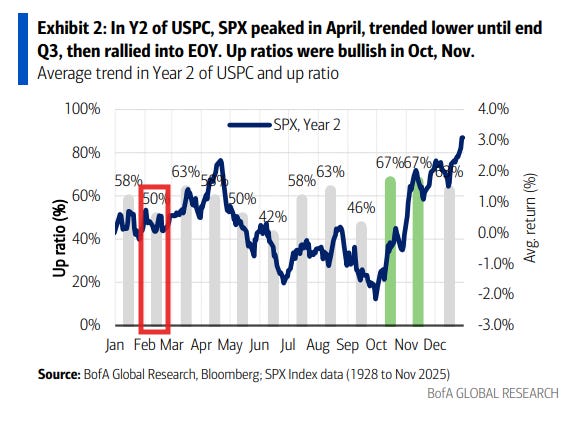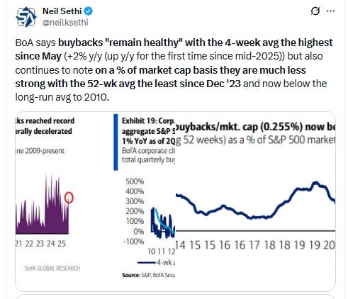 And after buybacks ended 2024 at record levels and started 2025 even better, they had by and large remained below seasonal averages from April until October when they seemed to have picked back up (depending on who you ask), but according to BoA and Goldman they accelerated into year-end and have continued to run at record levels on a nominal basis in 2026, although that is still just in line with the average since 2010 on a market cap weighted basis We are now starting to exit the buyback blackout window which will allow discretionary buybacks (~30% of all buybacks) to recommence.