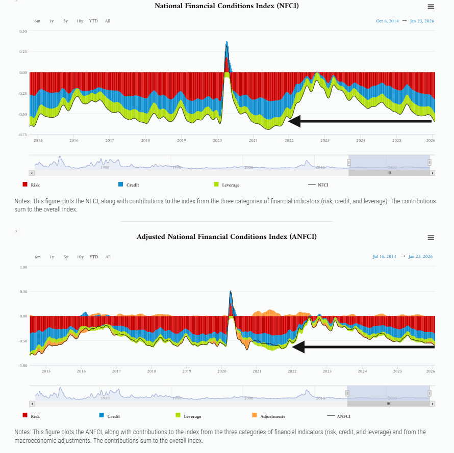 The Chicago Fed National Financial Conditions Index and its adjusted counterpart* each took another step down (looser) to the least (loosest) since Nov ‘21 in the week through Jan 23rd.
