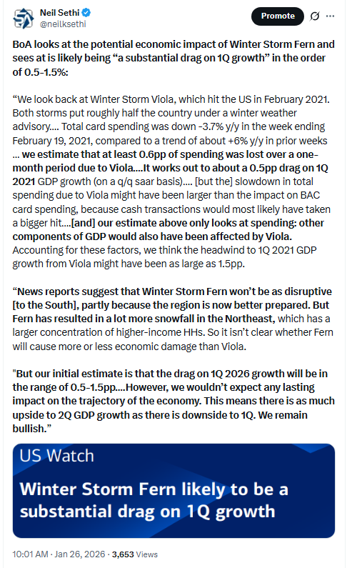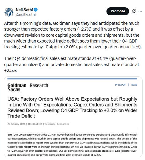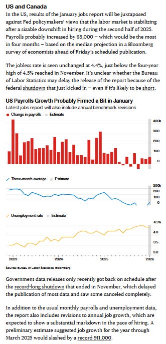 Note though the January jobs report is a little different in that it contains the “second half” of the QCEW revisions (which adjusts estimated employer payrolls to the actual best estimate we have - state unemployment insurance fund contributions). We got the first half (through March 2025) of that last year. This will revise the rest of 2025 (Apr-Dec). Last year that resulted in a more than 900k revision downward to 2025 job growth. While that large of an adjustment is not expected, if it’s anything close it will garner plenty of headlines (Jerome Powell for what it’s worth insinuated at one point he’s expecting something like -700k (-60k a month)).
