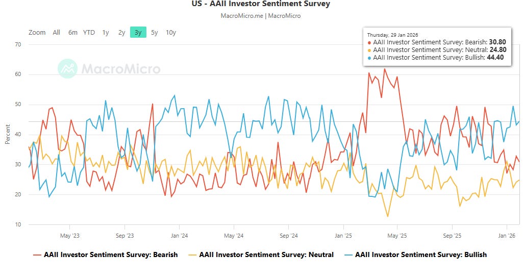AAII a little more bullish but still below the widest bull-bear spread since Nov ‘24 seen two weeks ago: