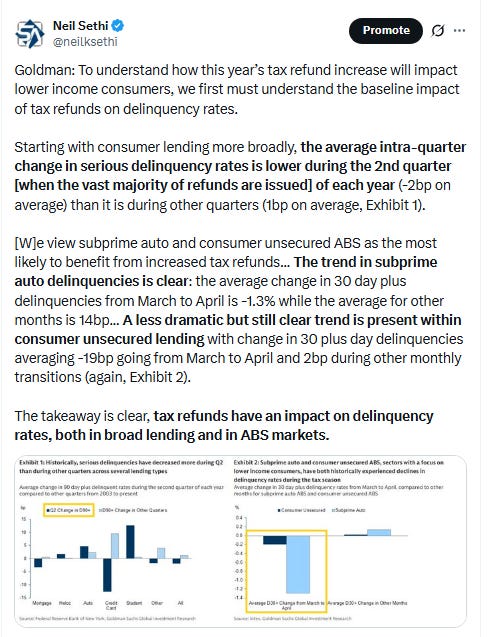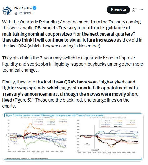 No non-Bill Treasury auctions (>1yr in duration) until they pick back up the following week, but we will get the Treasury refunding announcement. While no changes are expected to auction sizes at the upcoming quarter, there are expectations that they will need to change (increase) as we get into the second half of the year, which would mean the key language about stable auction sizes for upcoming quarters will need to change at some point. Such a change in language will likely see some disruption in markets.