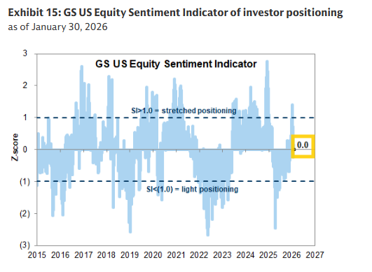 *The indicator combines “six weekly and three monthly indicators that span [across the more than 80% of the US equity market that is owned by institutional, retail and foreign investors]. Readings of +1.0 or higher have historically signaled stretched equity positioning. Readings of -1.0 or lower have signaled very light positioning and have historically been a statistically significant signal for subsequent S&P 500 performance”.