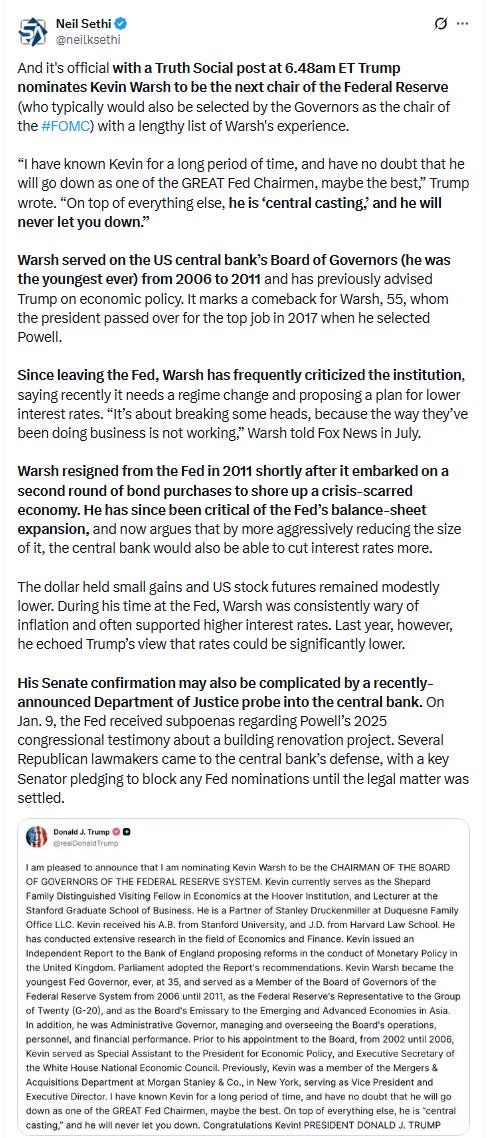 I did put in my posts about Warsh during the week which gives you some background, but given his time at the Fed was nearly two decades ago, there are some questions as to how useful that will be as a roadmap. But what we do know is that as recently as a couple of months ago Warsh was saying what was need was to “break some heads” and “regime change” at the Fed. Some of his proposals include: