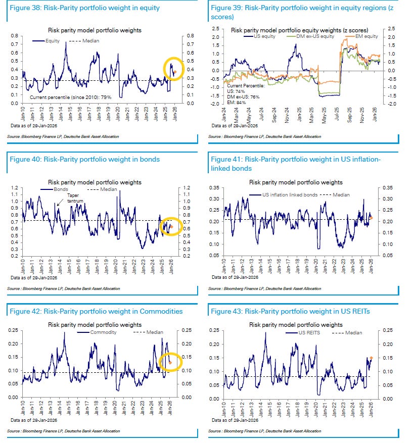 Risk-parity funds’ overall equity allocation increased this week (79th percentile), driven by increased allocation to the US (74th percentile), other developed markets (74th percentile), and EM (84th percentile). Their allocation to bonds (35th percentile) and inflation-protected notes (58th percentile) was trimmed, while allocation to commodities (77th percentile) rose modestly.