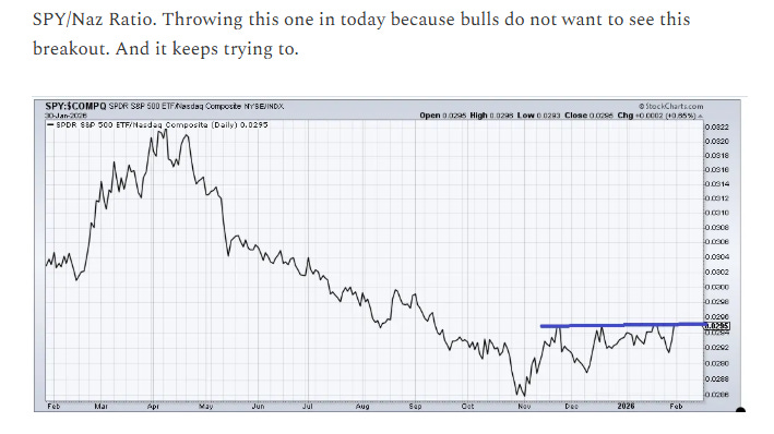 Sure we had a big whack in some groups last week (looking at you metals and software) but nothing broke. Most of what I see is what I have been looking for for 2 weeks now: the 493 were overbought and over-extended and needed to correct. The buck is the most interesting chart: was that a fake break? And the SPY/Naz ratio chart.