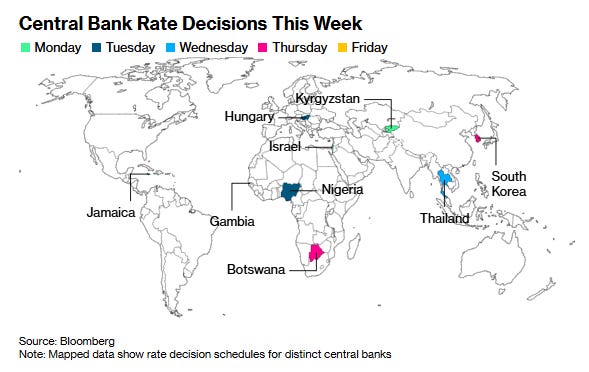 But in terms of what’s on the schedule, there are a few policy decisions highlighted by central banks in Korea and Thailand expected to keep interest rates steady, while Israel and Nigeria may cut. In terms of economic data, the focus will be on inflation with readings from the EU and Japan, as well as a number of sentiment reads.