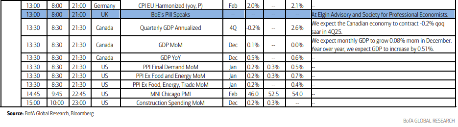Statistics Canada will release fourth-quarter GDP by expenditure, with the Bank of Canada expecting a flat reading even as industry-based data point to a contraction. US tariffs and slowing immigration continue to weigh on growth, while higher government capital spending and modestly accommodative rates are helping to offset some of that drag.