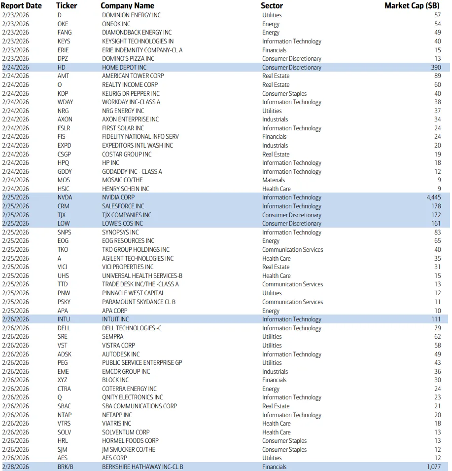 Q4 earning season also continues with ~50 SPX components but 12% of the SPX in earnings weight because we’ll get the biggest in NVDA (~$4.5tn market cap) on Wed. In addition, there’s another six >$100bn in market cap in HD, CRM, TJX, LOW, INTU, BRK/B (by reporting date - Berkshire is the 28th).