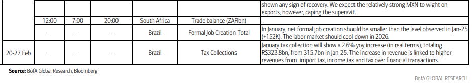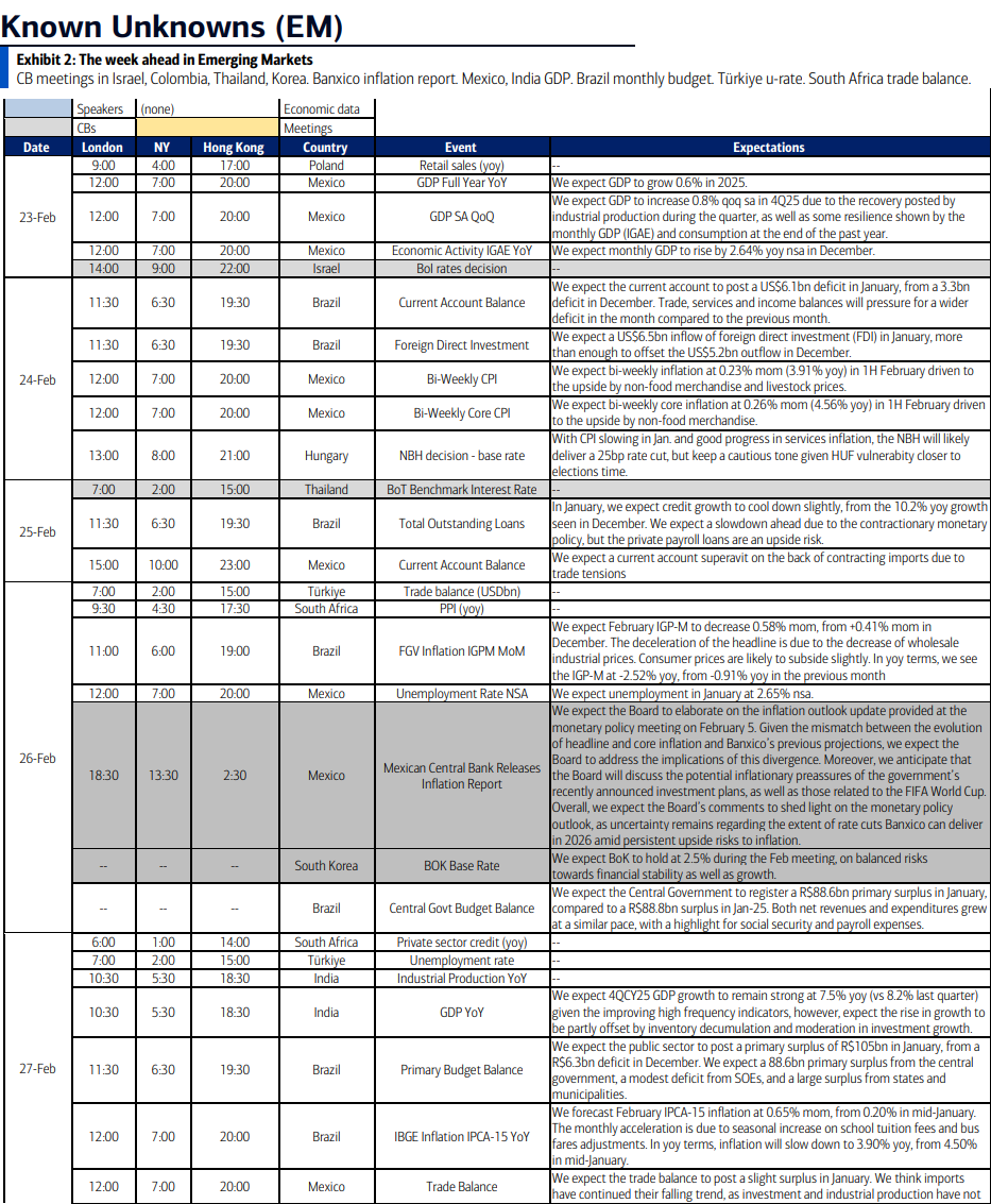 Several rate decisions are due in the region: On Monday, Israel’s central bank is expected to cut its benchmark by 25 basis points to 3.75%, as the shekel’s appreciation and a slowdown in annual inflation to 1.8% — below the midpoint of the 1%–3% target range — ease pressure on policymakers. Still, officials have sent mixed signals: Governor Amir Yaron said last month the bank would remain cautious on easing, while Finance Minister Bezalel Smotrich has stepped up calls for rate cuts. A day later, Hungary decides whether to begin a long-awaited cutting cycle that would come less than two months before a closely-watched general election. The same day, Nigerian policymakers are set to resume their easing cycle after inflation unexpectedly slowed in January. The central bank will likely lower its key rate by 100 basis points to 26%. On Thursday, Botswana is likely to leave the policy rate unchanged at 3.5% as inflation continues to accelerate.