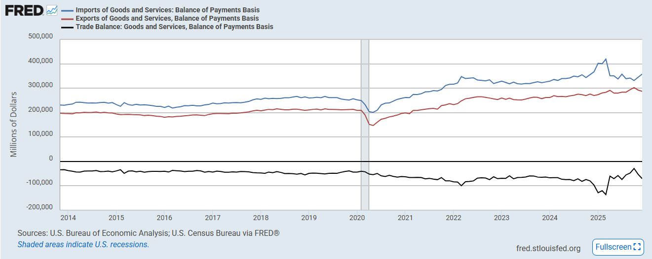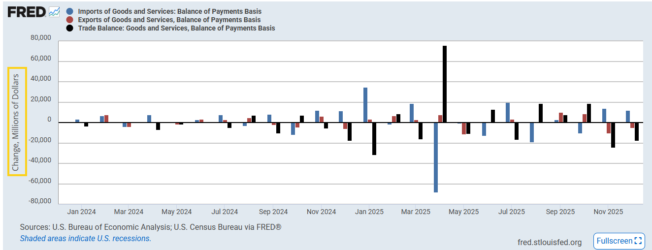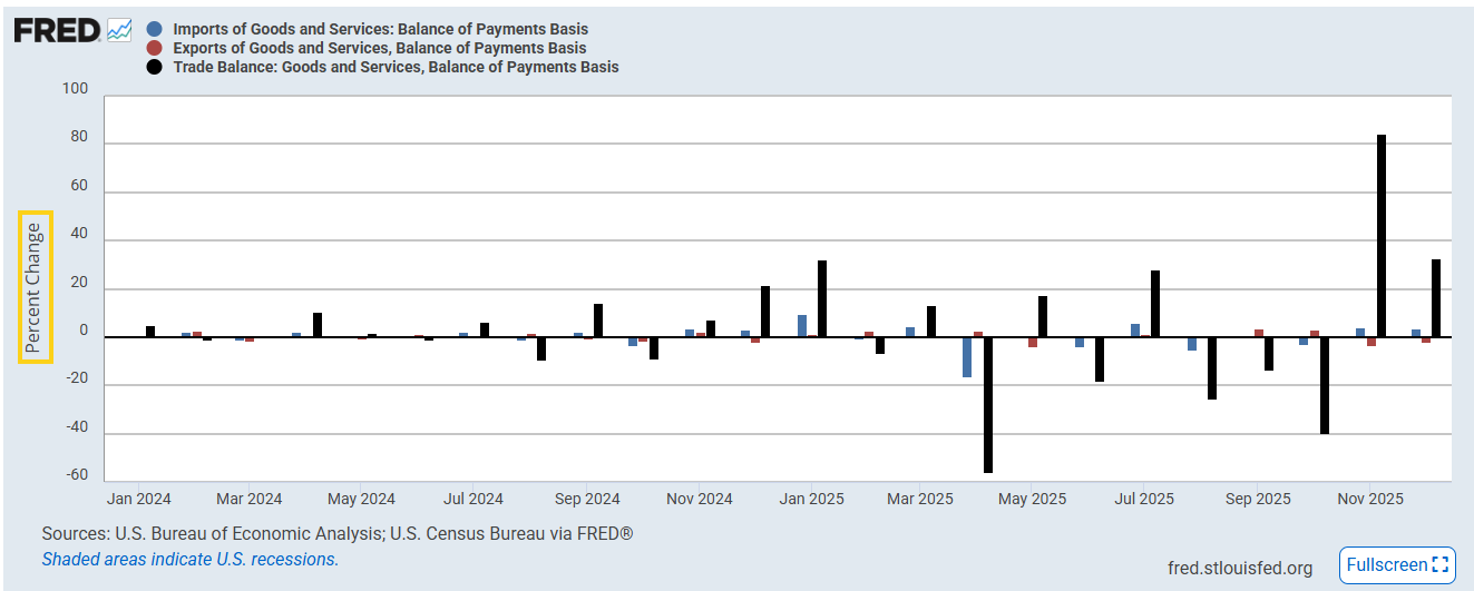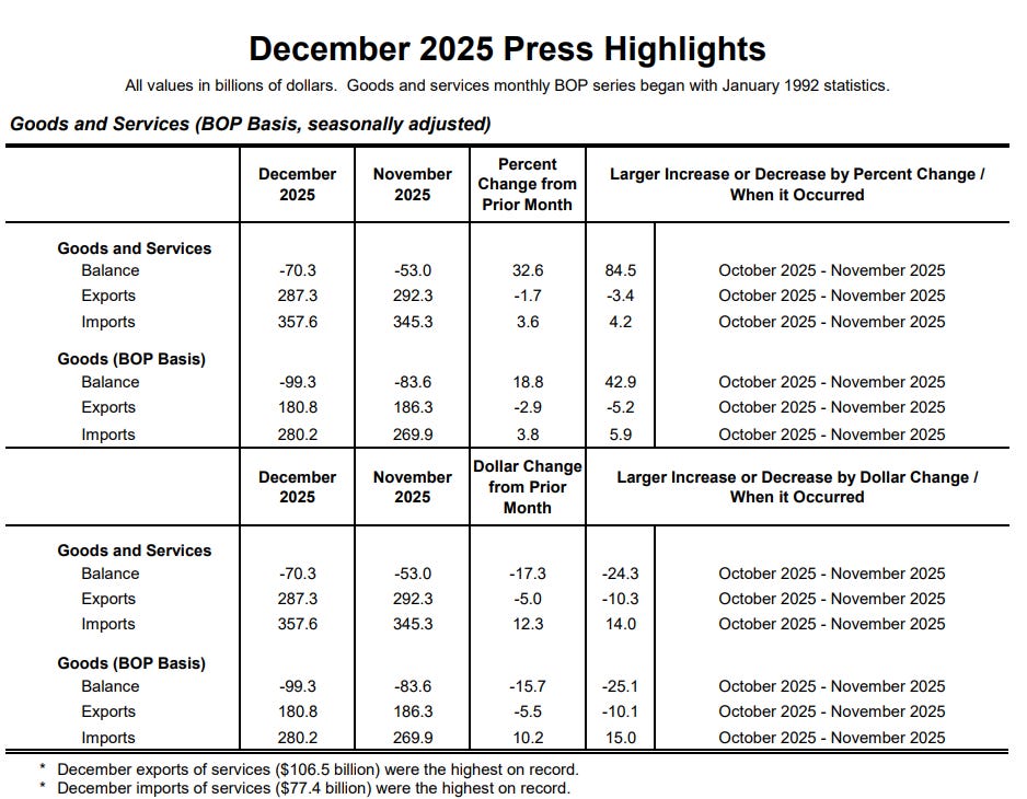 After the trade deficit grew +84% in Nov, the most on record (in USD terms it widened by $24.3bn, the most since Jan ‘25) it grew another +32% in Dec (widened by $17.3bn) to $70.3bn. As you can see from the charts it capped a relatively wild year of swings that in the end saw the third largest cumulative increase in the trade deficit on record (down slightly (less than a tenth of a percent) from 2024.