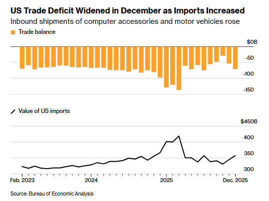 US Trade Balance (USD) Dec: -70.3B (est -55.5B; prev -56.8B; prevR -53.0B)